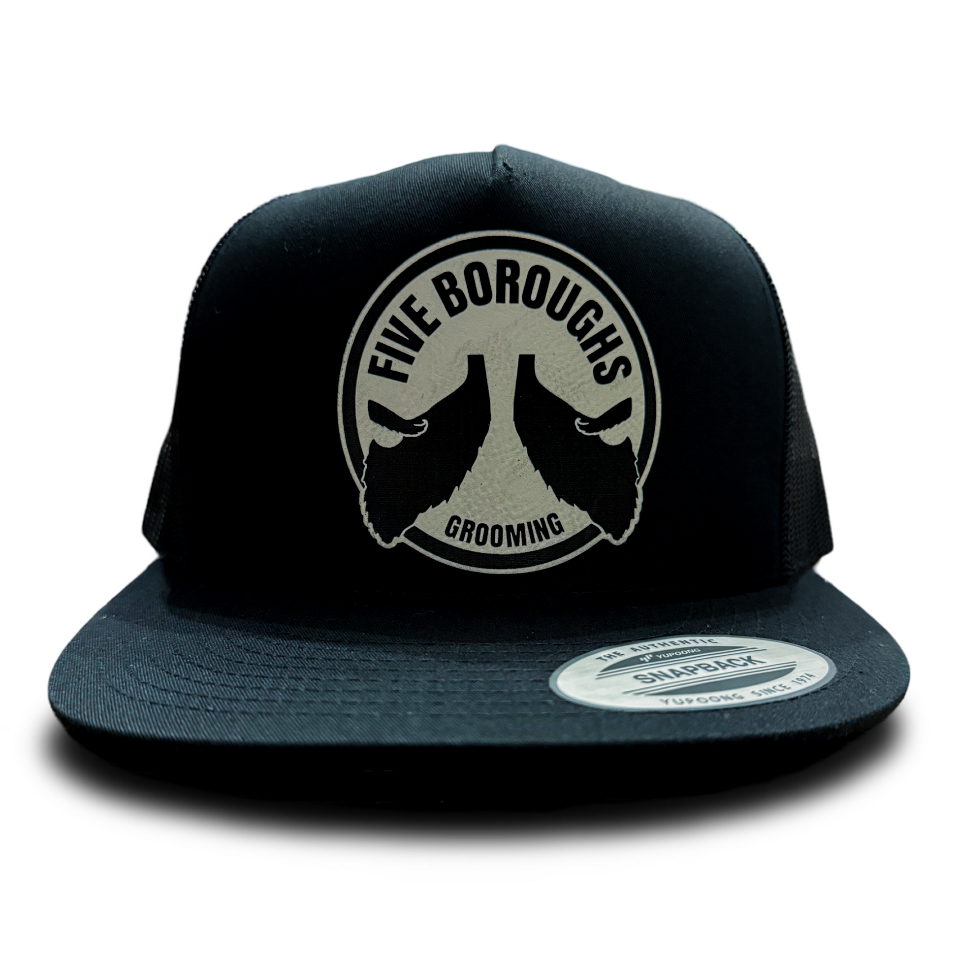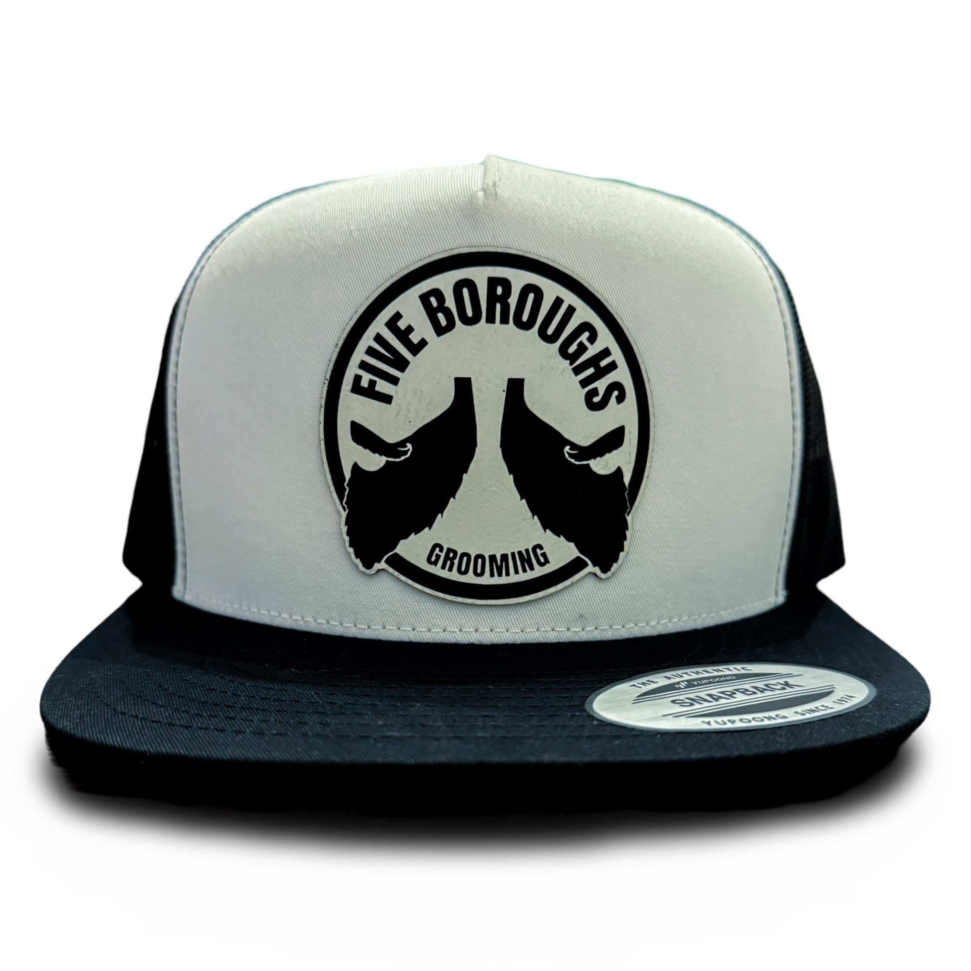 5 Panel Yupoong Flat Brim Trucker with 3” leather patch!